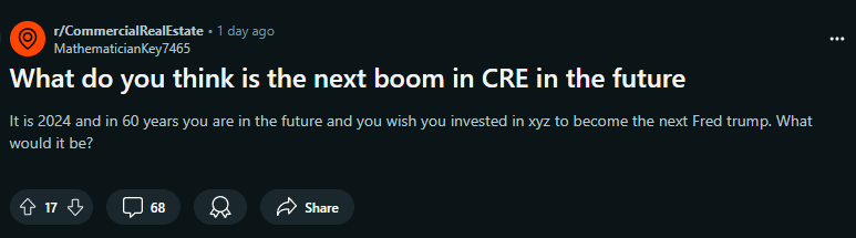 I saw the below post on the commercial real estate subreddit, and I couldn’t get it off my mind. Partially because 60 years from now is 2084 (any 1984 fans out there?) and partially because I was intrigued by the thought experiment.